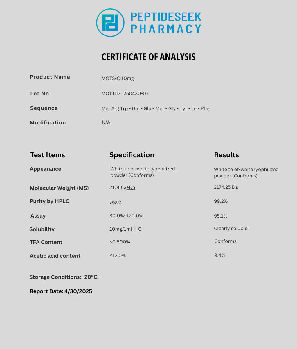 MOTS-c is a mitochondrial-derived peptide (MDP) composed of 16 amino acids, which plays a critical role in cellular metabolic regulation. Synthesized within mitochondria, MOTS-c functions by modulating the cellular energy balance through pathways involved in glucose metabolism, insulin sensitivity, and cellular stress response.  MOTS-c exerts its effects by translocating to the nucleus, where it influences the expression of genes related to mitochondrial biogenesis and metabolic regulation, particularly under conditions of metabolic stress. Research has shown this peptide to improve exercise capacity, reduce obesity, insulin resistance and other disease processes such as osteoporosis and the mitigation of metabolic disorders and age-associated diseases.